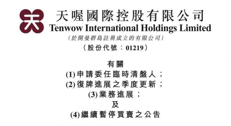 2018年11月12日晚間,天喔國際控股有限公司發布公告稱,公司的一名債權人與公司均在尋找清盤人進行清盤或重組。與此同時,天喔國際也已提交傳票,尋求委任公司低度干預的共同臨時清盤人以進行重組,作為強制清盤的替代方案。