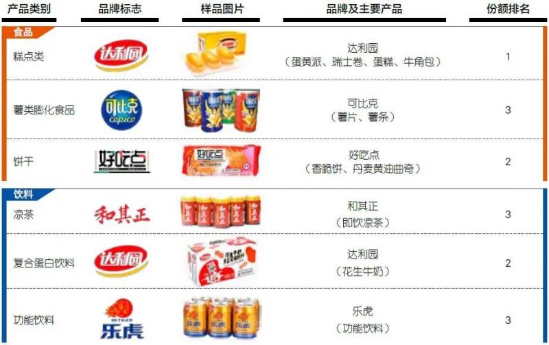例如:好吃點餅干、可比克薯片、和其正涼茶、達利園蛋黃派、樂虎功能飲料、達利園花生牛奶、青梅綠茶飲料……