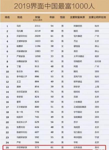 近日,界面新聞發布2019中國最富1000人榜,達利食品許世輝家族573億元人民幣財富,全國排名第25位,成為福建區域首富。