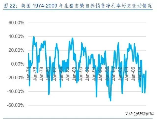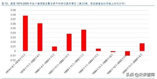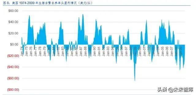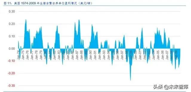 通過分析美國 1974-2009 年生豬自繁自養月度單頭盈利曲線的歷史走勢,我們發現在快速規模 化之前和初期,盈利曲線位于盈虧平衡線上方的時間寬度和盈利深度均要明顯大于盈虧平衡線下 方的部分。然而,伴隨著規模化進程的推進,盈虧平衡線上方和下方盈利曲線的對稱性趨于增強。