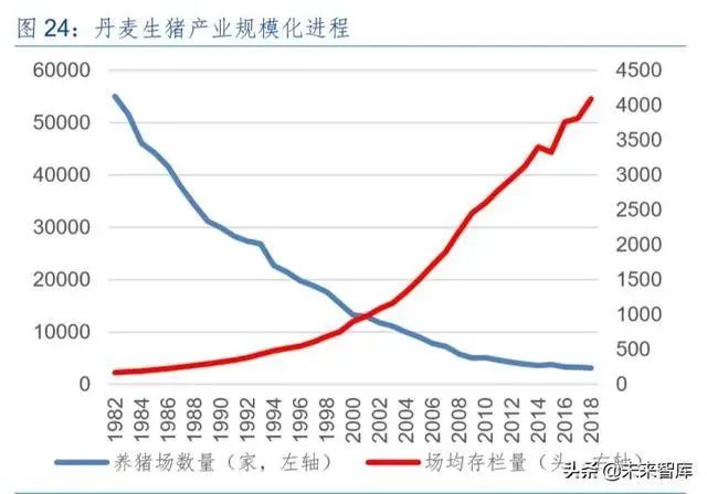英國生豬產業在 1970 年代到 1990 年代后期經歷過了一輪規模化進程,生豬養殖業的場均存欄 規模從 1966 年的 70 頭大幅攀升至 2000 年的 600 頭。作為一個整體,歐盟也在經歷著規模化 進程,例如歐盟 2005 年共有超過 380 萬家生豬養殖場,到了 2013 年剩下不到 220 萬家,單場 養殖規模也在明顯提升。具體國家來看,以丹麥、德國和西班牙為例,丹麥國內的生豬養殖場從 1982 年的 55023 家持續下降至 2018 年的 3125 家,場均存欄規模從 169 頭大幅提升至 4090 頭,年屠宰萬頭以上的屠宰場從 1970 年的 54 家減少至 2018 年的 8 家(合作社組織在丹麥的生 豬產業經營中發揮著重要作用)。德國和西班牙也同樣經歷規模化進程,養殖場數量下降,單場 養殖規模提升。