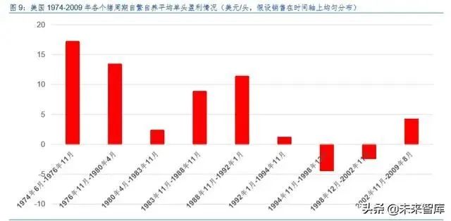 單位盈利曲線對稱性明顯提升給生豬產業帶來什么影響?從 1974 年到 2009 年,美國豬價大致 可以劃分出 9 輪豬周期。在假設生豬銷售數量在時間軸上均勻分布的情況下,我們發現快速規模 化之前和初期的周期單頭盈利水平要明顯高于規模化成熟階段的周期單頭盈利水平。隨著規模化進程的推進,豬周期為單位的單頭盈利水平總體處于下行趨勢,這主要是由單位盈利曲線對稱性 明顯提升所導致。
