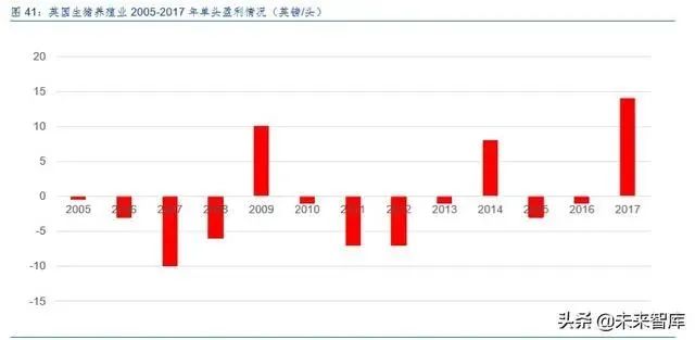 英國生豬產業在經歷過 1970 年代期到 1990 年代后期的一輪規模化進程后,從 2000 年開始逐 漸進入成熟穩定期。從 2005-2017 年的年度單頭盈利水平來看,盈虧平衡線上方和下方的盈虧 幅度對稱性較為明顯。與前面美國和加拿大的特征較為相似。