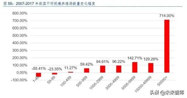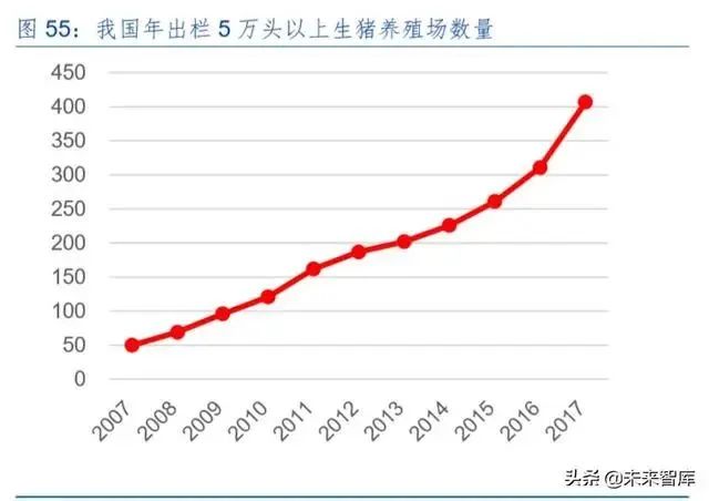 與美歐日等國家和地區生豬產業規模化的動因不完全相同,我國生豬養殖行業是在城鎮化、勞動力機會成本上升、豬肉產銷量增速放緩、豬飼料行業飽和促使飼料企業往下游養殖延伸、環保壓力加大等多因素的驅動下,逐漸進入類似美歐日的規模化進程,小散戶加速退出,中大規模 養殖場(企業)市場份額持續增加。一方面,我國年出欄 500 頭以下的生豬養殖場數量在持續 減少;另一方面,我國年出欄 50000 頭以上的生豬養殖場數量在持續增加。2007-2017 年,我 國出欄 50 頭以下的養殖戶數量減少了 55.41%、出欄 50-99 頭的數量減少了 23.35%,出欄 5000-9999 頭的養殖場數量增加了 142.71%、出欄 10000-49999 頭的養殖場數量增加了 129.28%、出欄 50000 頭以上的養殖場數量增加了 714%。伴隨著規模化進程的推進,我國生豬 產業的生產效率也在逐漸提升,例如我國生豬的 MSY 水平從 2009 年的 13 上升至 2018 年的接 近 20。歐美先進國家 MSY 平均水平在 26,丹麥全球最高,已經突破 30,我國生豬產業的生產 效率仍有很大的提升空間。