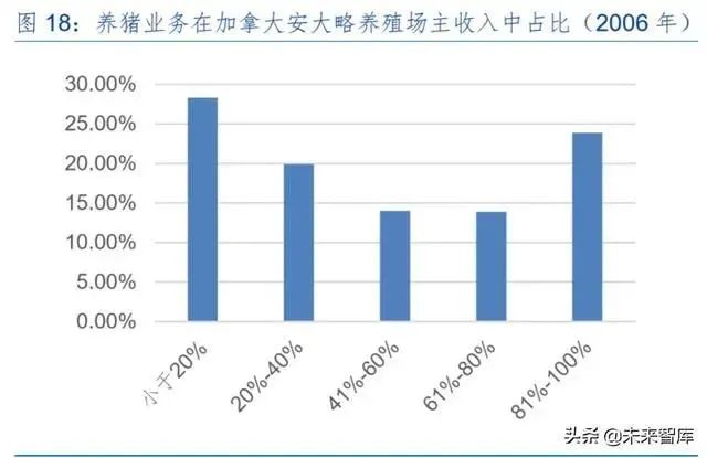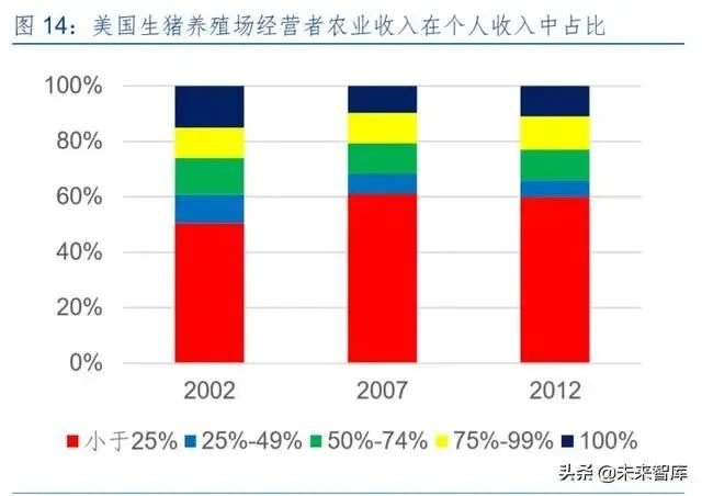 根據美國 2002 年、2007 年和 2012 年三次農業普查的數據,美國生豬養殖場經營者中以農業為 主業的比例平均約為 57%,也就是說有 43%的生豬養殖場經營者只是把農業作為副業。農業收 入在個人收入占比小于 25%的養殖場經營者約占總數的 57%,農業收入在個人收入占比小于 50% 的養殖場經營者約占總數的 65%。年齡大于 65 歲的生豬養殖場經營者占總數 13%,年齡大于 45 歲的生豬養殖場經營者占總數 67%。在加拿大的生豬養殖產業中,以安大略省為例,1999 年養殖場主年齡大于 55 歲的占 23%,51-55 歲的占 14%,2006 年非養殖業務收入占個人收入 大于 50%的養殖場主占總數的接近一半。