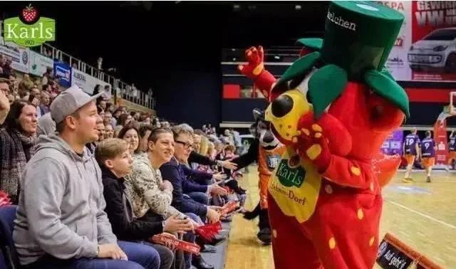 德國卡爾斯草莓農(nóng)莊與足球、籃球等熱門體育項目合作,宣傳自己的品牌。萌萌噠的草莓吉祥物高調(diào)亮相各種賽場。
