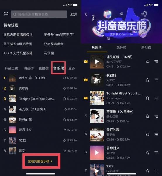 (2)抖音音樂榜,在【搜索】頁面下方,每周更新,選用排名靠前的音樂,可以蹭熱度