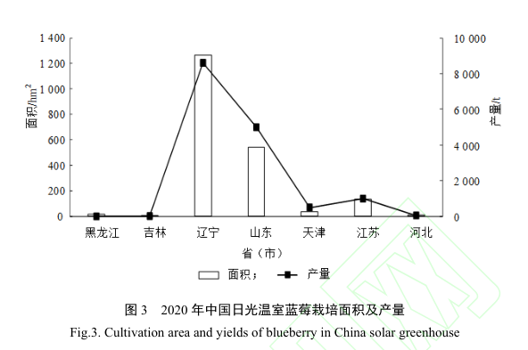 我國早熟藍莓以其鮮果商品率高和市場價格高等優勢在全年市場供應上具有極其重要的地位,日光溫室和冷棚栽培模式的應用實現了藍莓優質早熟鮮果的供應,因此,這兩種設施栽培模式成為當前北方的重要種植方式。到 2020 年底,全國日光溫室栽培面積 2010 hm 2 ,產量 15 185 t。其中,遼寧省位居第一,栽培面積和產量分別占全國的 63.0%和 56.6%;山東省位列第二,面積和產量分別占全國的 27.0%和 32.0%;江蘇省位列第三位,面積和產量分別占全國的 6.6%和 6.5%。全國冷棚栽培面積 705 hm 2 ,產量 7 510 t。山東省位居全國第一,產量和面積分別占全國的 71.0%和 66.6%;遼寧省位居第二,面積和產量分別占全國的 17.7%和 20.0%。吉林省和黑龍江省由于冬季嚴寒,設施生產加溫成本高等因素制約,藍莓的設施生產一直停滯不前。2020 年,中國日光溫室藍莓栽培面積及產量見圖 3,冷棚藍莓栽培面積及產量見圖 4。