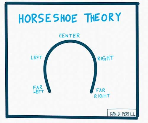 極端對立面往往看起來相同。例如,極右運(yùn)動和極左運(yùn)動可能同樣暴力,或者渴望得到類似的結(jié)果。兩邊的人比中間派的人更相似。