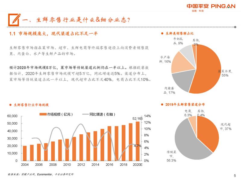 生鮮零售市場指在菜市場、超市、生鮮電商等終端零售途徑上向消費者銷售蔬果、肉蛋白、水產等生鮮產品的市場。根據歐睿數據估計,2020年生鮮零售市場規模可超5萬億。渠道分布上,菜市場等傳統渠道占比一半以上,超市、生鮮電商等現代渠道取代傳統渠道的空間巨大。