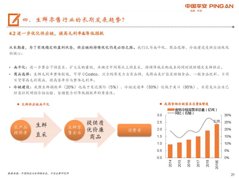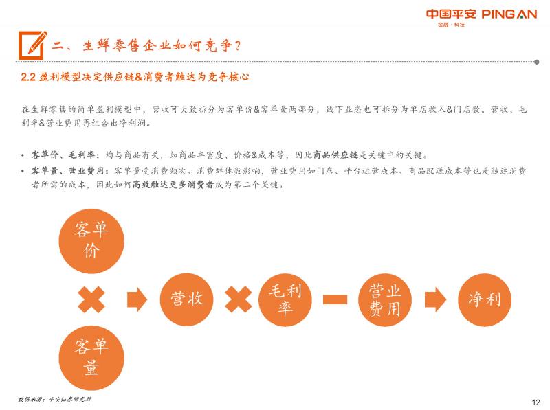 線上線下零售巨頭均在生鮮零售各領域大規模布局,行業開始劃分陣營對壘。其次,生鮮零售的盈利模型決定供應鏈&消費者觸達為競爭核心:1、企業不斷整合下游需求、往上游直采,持續優化供應鏈。2、企業嘗試同時經營多種業態,進一步貼近消費者,擴大消費群體。