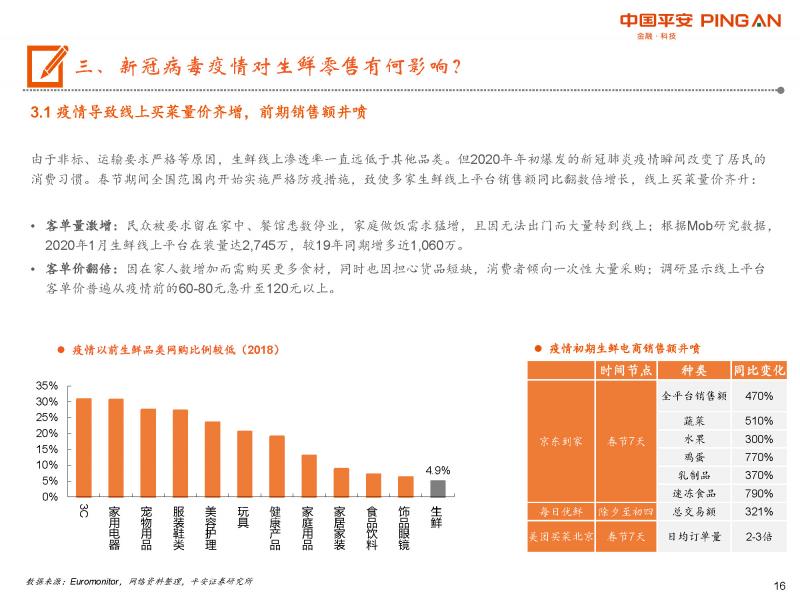 疫情導致線上買菜量價齊增,生鮮電商銷售額井噴。特別是新用戶數大幅增加、消費人群發生改變,因此本次疫情或是培養生鮮線上消費習慣的一次良機。但我們認為新消費者的留存可能并非易事:1、線上買菜模式未成熟,難以提供最佳消費體驗。2、隨著工作生活逐步回到正軌,家庭做飯、從線下轉移的需求或不可持續。3、需求退坡后補貼戰或將再起。