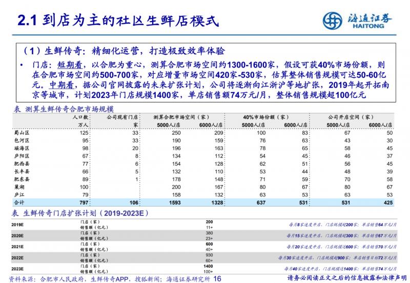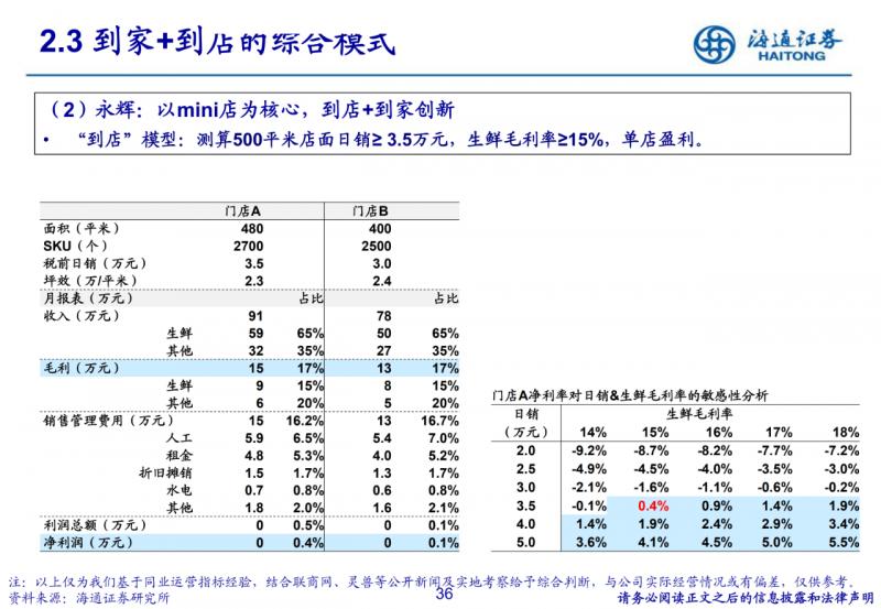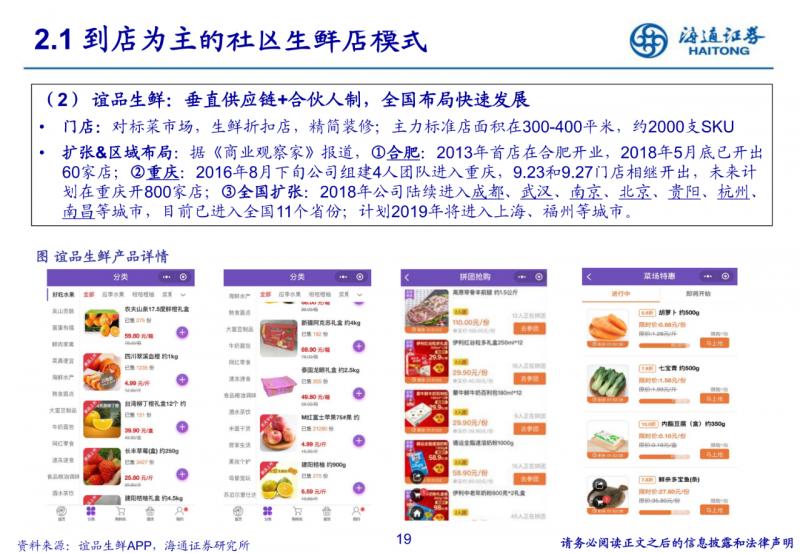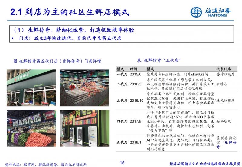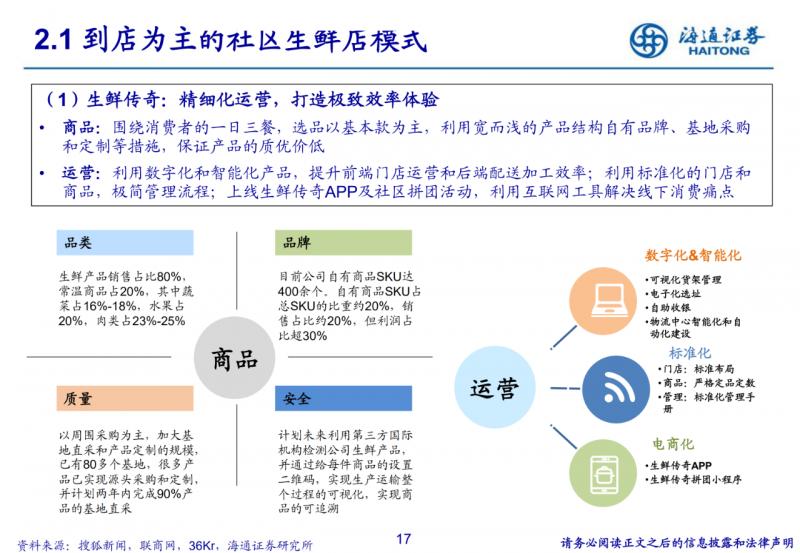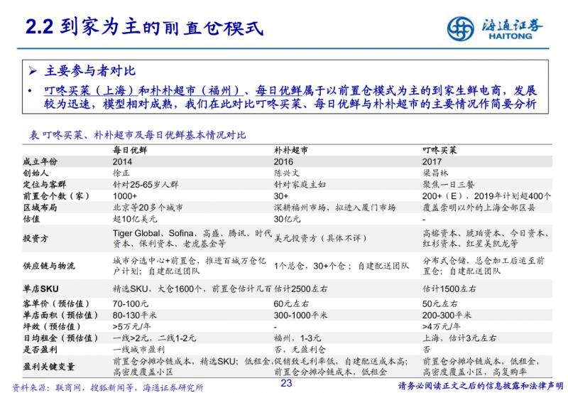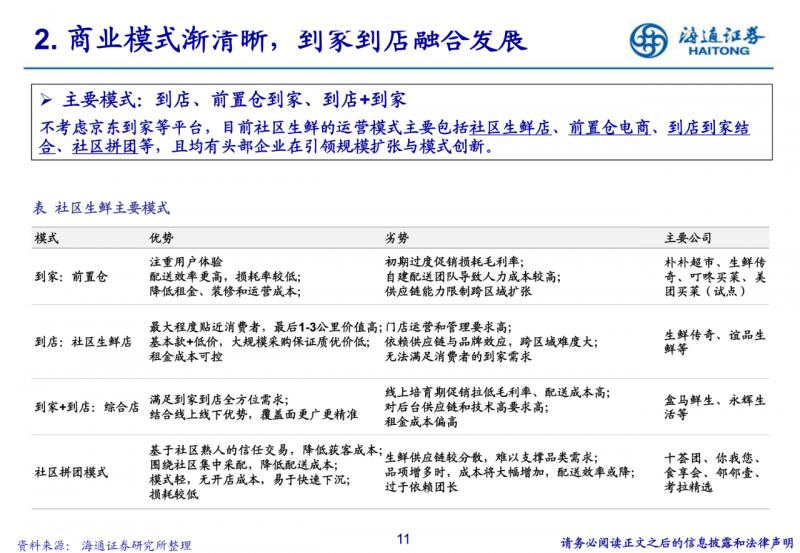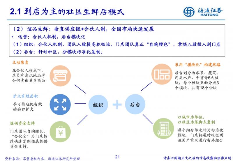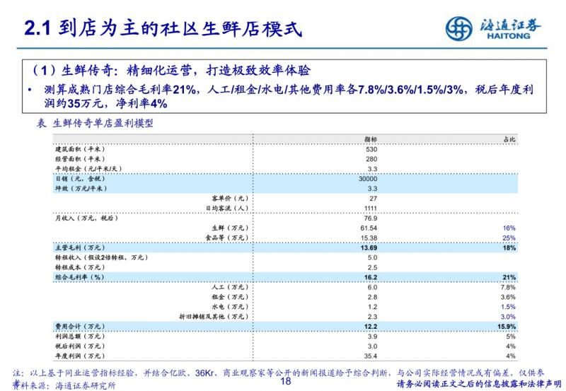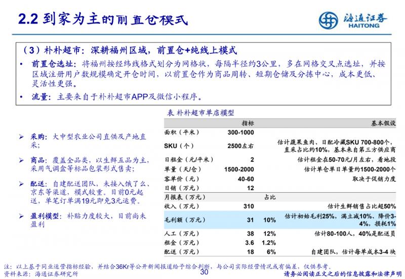 到店為主的社區生鮮店模式。400-500平米社區店,主打生鮮,便捷、低價、優質;但依賴供應鏈與品牌效應, 跨區域難度較大。