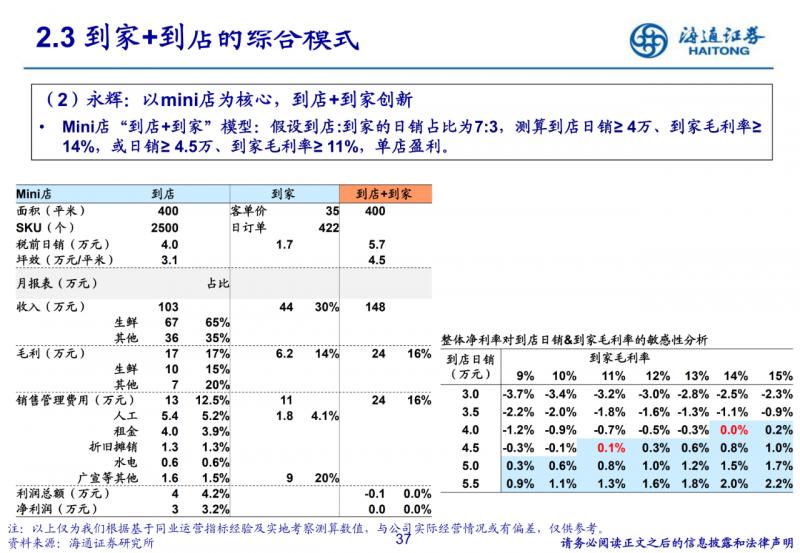 到家+到店的綜合模式。結合到家和到店優勢,滿足用戶全渠道消費需求,但線上培育期拉低毛利率,對門店 運營、供應鏈、技術等綜合要求高。