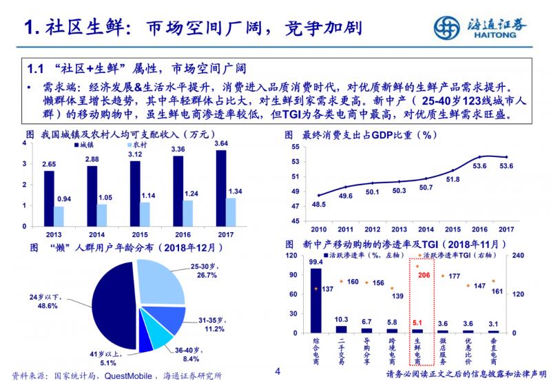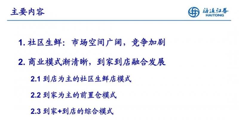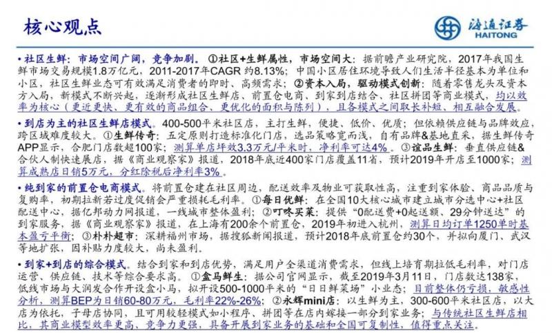 社區生鮮:市場空間廣闊,競爭加劇。隨著零售龍頭及資本方入局,新模式不斷興起,逐漸形成社區生鮮店、前置倉電商、到家到店結合、社區拼團等商業模式,均以效 率為核心(更近更快、更有效的商品組合、更優化的面積與陳列),且各模式之間取長補短、相互融合發展。