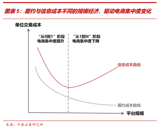 履約與信息成本不同的規模經濟屬性,推動中國電商集中度變化。在電商“從0到1”的階段,是新的履約模式形成的階段。履約成本的規模經濟屬性與信息成本早期的規模經濟屬性使電商市場呈現集中化趨勢。