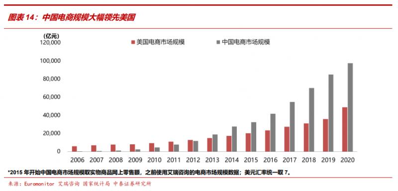 中國電商市場規模大幅領先美國。中國電商起步較晚,但高密度人口和制造大國的背景成為了推動電商高速發展的沃土。目前中國電商市場規模約為美國的兩倍,也是全球范圍內銷售規模最大、商業模式迭代最快最先進的市場。