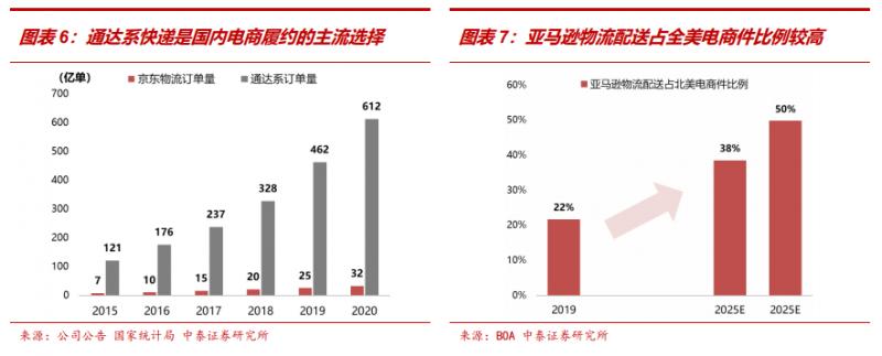 而亞馬遜在美國采取的倉配模式正逐漸成為主流模式。根據BOA研究報告,2019年美國電商件數量為106億件,其中亞馬遜物流承載了近22%;預計到2025年,亞馬遜物流配送的快遞量將達到75-97億件,占到全美電商件的38%-50%。