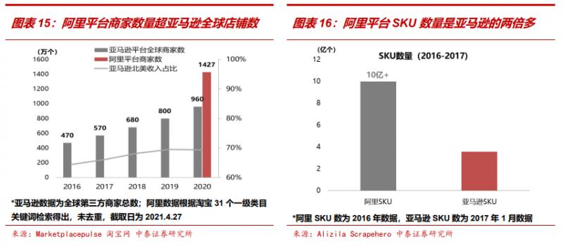 那么可簡單估算出,中國阿里平臺商家數量約為亞馬遜北美商家數量的2倍。根據Alizila和Scrapehero的數據,2016年,阿里平臺SKU數量已經超過10億個,同期亞馬遜平臺約有3億多,中國的商品在線數量也大幅超過美國。