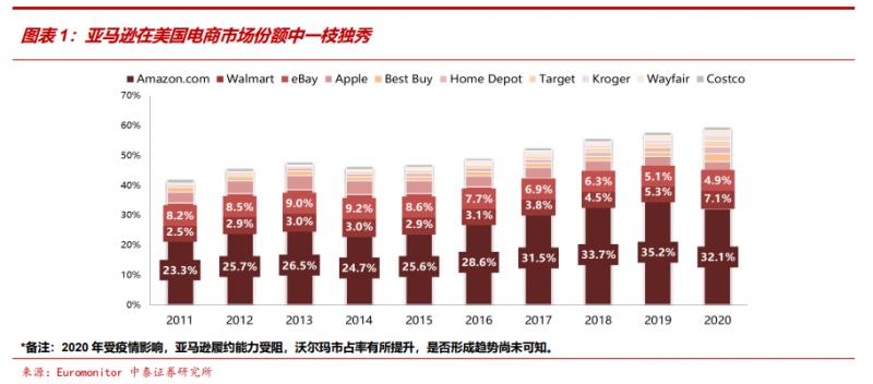 亞馬遜在美國電商市場一枝獨秀。盡管美國電商整體規模不如中國,但龍頭企業競爭優勢更為顯著。亞馬遜在美國電商行業市占率穩步提高,不僅將早期的競爭對手eBay遠遠甩在身后,也持續大幅領先于行業第二沃爾瑪,龍頭地位相當突出和穩固。