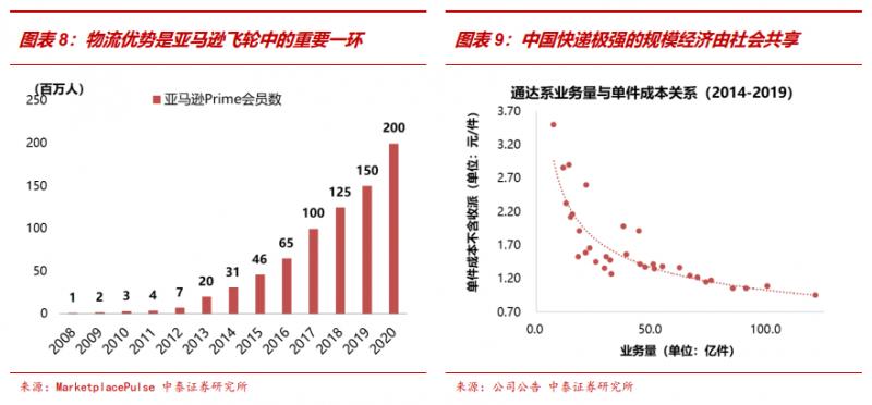 亞馬遜依靠履約設施建立壁壘,而中國電商共享快遞紅利。在投入大量資產建立自有倉配設施之后,亞馬遜得以推出兩日達的物流服務,客戶只要購買Prime會員即可免費使用。