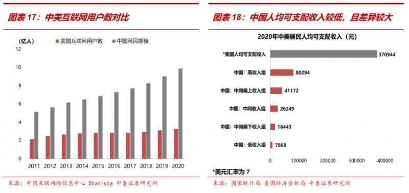 用戶角度,中國不僅規模領先,且人群需求屬性更為多樣化。2020年,中國/美國網民規模分別為9.9/3.3億人;其中,中國網絡購物用戶達7.8億人,大幅領先美國。與美國相比,中國居民人均可支配收入水平較低,且內部差異較大。中國消費者持續分化,消費需求呈現出復雜化、多元化的特征。