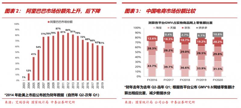 中國電商市場從高度集中走向多元發展。反觀中國市場,在過去的近20年間先集中,后多元。拼多多更是在阿里京東的夾擊下異軍突起,成為又一個平臺式電商巨頭。