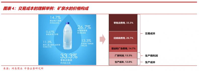 交易成本的概念與范圍。簡單舉例:一瓶售價為1.5元的礦泉水,其產品成本只有0.18元,剔除0.2元的生產商利潤,剩余1.12元都屬于商品流通的交易成本,占售價的75%。這些交易成本包含了營銷、物流、經銷商利潤等費用,最終都被加入產品的售價中,由消費者買單。