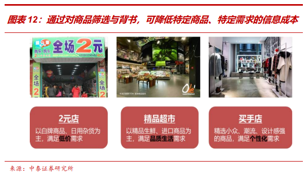 線下零售時代,大賣場與便利店共存,“兩元店”與精品店共存,各類零售商在有限的物理空間內篩選出特定特征的商品,以提升某一類需求的信息匹配精準度。這一降低信息成本的方式,并非是靠信息量的增加,反而是依賴于信息量的限制與篩選,體現出負規模經濟屬性。