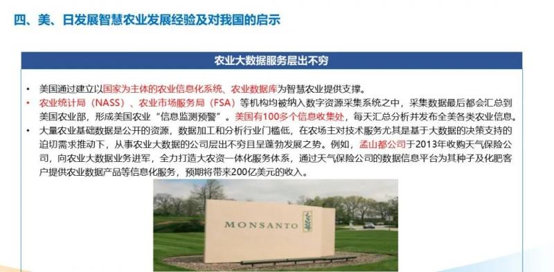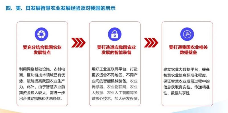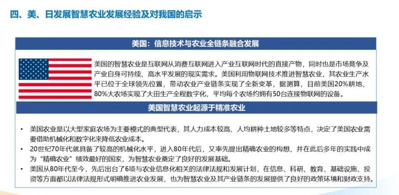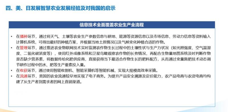 3、美國通過全面推進(jìn)信息技術(shù)與農(nóng)業(yè)全鏈條融合發(fā)展,在種植、管理、收獲、流通等環(huán)節(jié)均通過物聯(lián)網(wǎng)、農(nóng)業(yè)大數(shù)據(jù)、電子商務(wù)等措施,打造了全閉環(huán)式的智慧農(nóng)業(yè)發(fā)展模式。