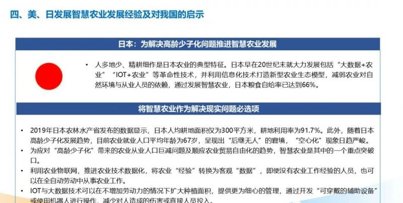 4、日本農(nóng)業(yè)面臨從業(yè)人口老、后繼無人等困境,通過推進(jìn)智慧農(nóng)業(yè)發(fā)展,利用信息化技術(shù)打造新型農(nóng)業(yè)生態(tài),大大降低農(nóng)業(yè)對自然環(huán)境與從業(yè)人員的依賴。