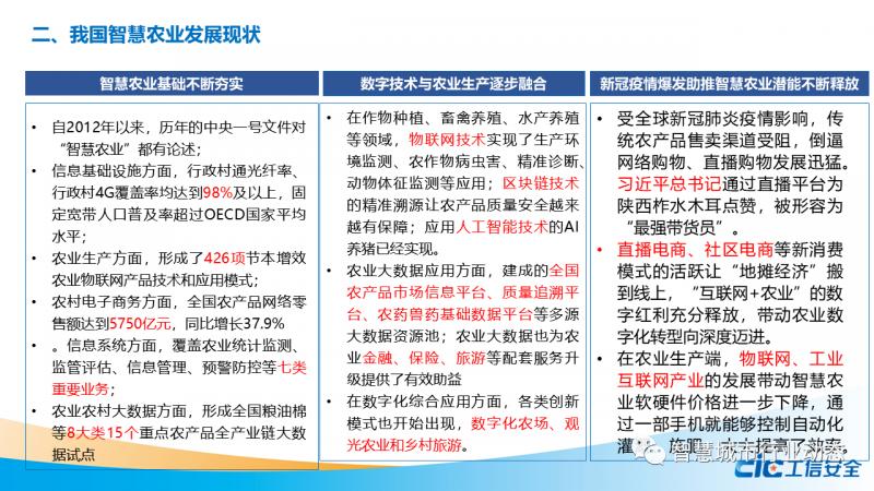 2、但總體上來看,我國智慧農(nóng)業(yè)仍處于起步階段,仍存在明顯短板,尚不具備整體推進(jìn)智慧農(nóng)業(yè)的條件,缺乏具體可落地實(shí)施的細(xì)則和支持方案,數(shù)據(jù)資源尚未完全打通,對于智慧農(nóng)業(yè)本身認(rèn)知仍有不足。