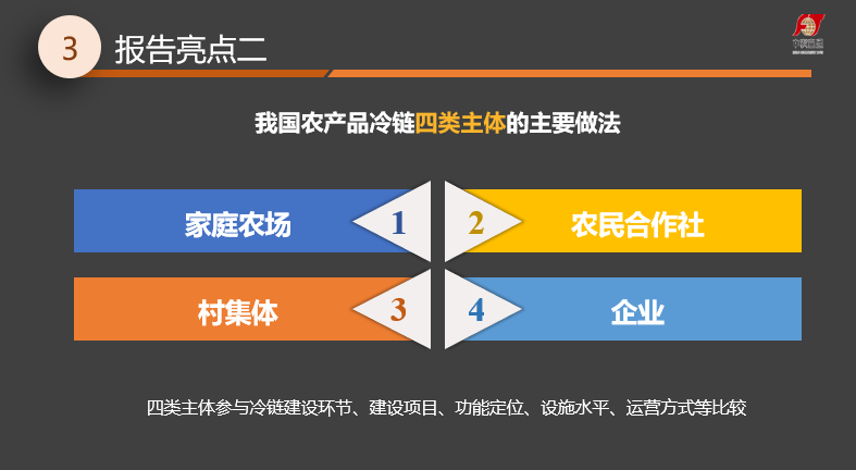 報告梳理農產品倉儲保鮮冷鏈物流建設過程中,涉及的家庭農場、農民合作社、村集體及企業等主要經營主體,分析各類主體參與農產品冷鏈建設的定位及經營模式等。