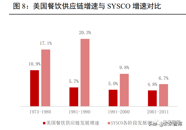 其中 SYSCO 作為預制菜龍頭企業地位穩固。目前 SYSCO 通過大量兼并收購將營銷及物流觸角遍布 90 多個國家和地區,在美國餐飲供應市場占有率高達 16%,是全球預制菜企業標桿。西斯科于 1969 年由九個 公司聯合后次年上市。成功上市后,美國經濟迎來黃金時代,消費群體外出就餐率逐年攀升(從 1992 年到 2002 年,在外就餐的消費比例增長 58%),但沒有出現全國性的食品供應商。食材配送以及相關城市配套服 務迎來高速發展風口,SYSCO 執行擴張策略,通過并購區域性小供應商來實現快速擴張。2017-2021Q1, SYSCO 的毛利率始終維持在 18%-19%左右,與 50%左右的毛利率的公司相比處于較低的水準。目前 SYSCO 仍以薄利多銷作為主要的盈利手段,經過前期擴張兼并、并購形成的規模效應已經成為 SYSCO 核心護城河。