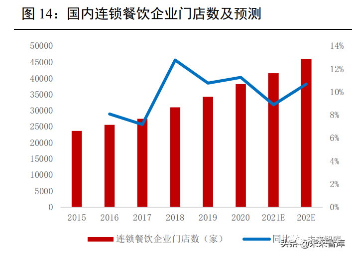 B 端餐飲企業對預制菜需求增加。預制菜產品選擇多元化,量產、標準化生產更能保證口味的穩定性。更重要的是預制菜可以減少后廚人員,提高出餐速度、降低生產成本、避免食材在生產中的浪費。2020 年 我國正餐類餐飲企業的生產成本中,接近 40%來原材料,22.41%來自人工成本,成為兩項最大成本開支來 源。預制菜對餐飲企業產品標準化降低損耗、減少廚師和切菜小工時間、節約廚房操作空間,提高出臺率 等成本控制和提升效率方面創造較大價值。2021 年中國連鎖餐飲門店達到 41641 家,持續保持高增速。連 鎖門店需要標準化生產快速復制達到規模化,對于增效將本的需求高。連鎖門店數量上升也標志預制菜品 需求量不斷提升。