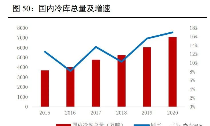 隨著電子商務興起,我國物流行業的到飛速發展。伴隨我國城鄉居民收入水平不斷提高,消費者對食品 多樣性、營養性、口感需求大幅提升,加之生鮮電商市場快速崛起,共同助推冷鏈物流行業進入發展快車 道。據中物聯冷鏈委數據顯示,2015-2019 年我國冷鏈物流市場規模持續擴大,年均復合增長率約為 17%, 2019 年冷鏈物流行業市場規模達到 3391 億人民幣,同比增長 17.5%。2020 年整體市場產值超過 4000 億元, 預計 2021 年有望突破 4500 億大關。2015-2020 年我國冷庫總量呈逐年遞增趨勢,2020 年全國冷庫總量達 7080 萬噸,新增庫容 1025 萬噸,同比增長 17%。在專業物流企業帶動下,低溫保鮮技術、車輛設計制造技 術、信息化物流配送技術的到進一步發展,新技術運用使冷鏈配送成本大幅降低。
