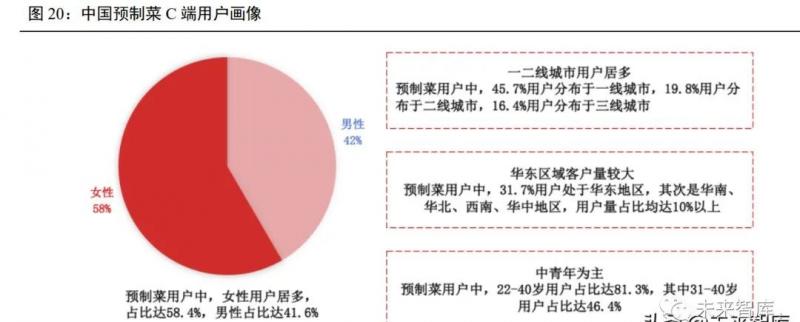 宅家文化、懶人經濟、烹飪小白、單身群體不斷擴容,給預制菜提供發展的先決條件。目前 C 端的預 制菜以大眾消費為主,食材也偏向大眾化。從預制菜 C 端用戶畫像來看,近 6 成為女性用戶。從年齡來看, 用戶主要以中青年群體為主,超過八成用戶年齡在 22-40 歲,其中 31-40 歲用戶占比超過 45%,這類年齡人 群是廚房消費主力軍。從城市線級來看,一二線城市用戶居多,45%以上用戶分布于一線城市,接近 20% 用戶分布于二線城市。