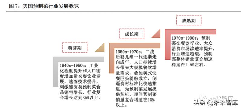 20 世紀 60 年代,凈菜開始在美國實現商業化經營,通過供應餐飲行業,使餐廳、配餐公司等外食產業 降低人工費、水電費和垃圾處理費,減少廚房面積和生產設備采購。之后部分凈菜企業開始面向家庭、個 人零售,方便居民日常烹飪。按照行業增速劃分,美國預制菜行業發展歷程可以分為三個階段。