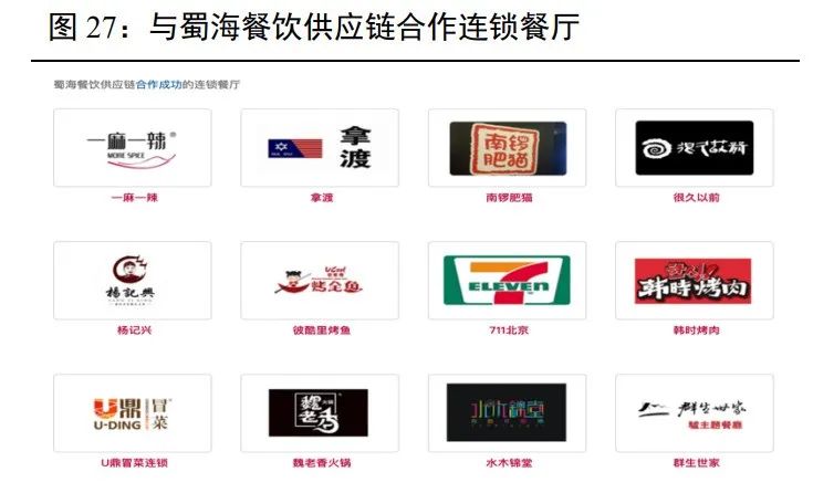 (2)新零售派:直接聚焦 C 端市場的新零售企業在預制菜賽道扮演前沿趨勢開拓者,用快手菜抓住年 輕消費群體。這類企業品牌業務廣泛,可以提供豐富的產品組合品類,滿足消費者對氧化需求。以預制菜 成熟品牌蜀海為例,目前逐步成為 C 端供應行業標桿。例如,蜀海成立于 2011 年,目前是一家集銷售、研 發、采購、生產、品保、倉儲、運輸、信息為一體的餐飲供應鏈服務企業。曾隸屬于海底撈集團供應鏈部 門,為海底撈全球門店服務多年。在積累豐厚食材供應鏈能力后脫離海底撈完全獨立。目前蜀海擁有 SKU 過萬,已研發多款中餐半成品,包括中餐腌制料理品、半成品、中餐醬料醬汁、鹵制產品以及冷凍菜肴, 打造豐富預制菜全品來菜單。