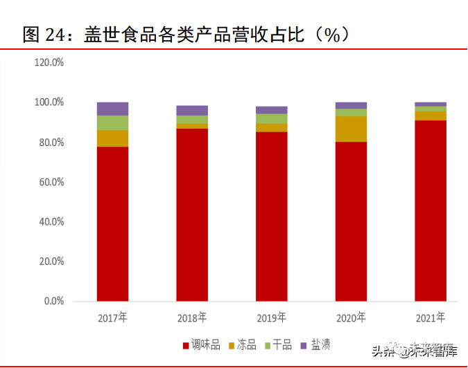 公司是國內預制涼菜領導企業。公司成立于1994年,以海藻、食用菌、魚籽等系列海珍 品為主要食材,為國內、外餐飲企業提供預制涼菜。公司主要產品按照產品屬性劃分,包括藻類、菌類、山野菜、魚籽及海珍味等系列開胃涼菜產品;按照加工方式劃分,包括調味品類、干品類、凍品類、鹽漬類產品,其中調味品類是核心品類,是公司收入的主要來源。