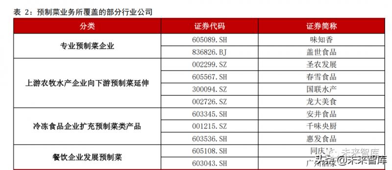 目前涉足預制菜的上市公司較多。A 股涉足預制菜的上市公司主要有以下幾類:專注預 制菜領域的企業,以味知香和蓋世食品為代表;上游農牧水產企業向下游預制菜延伸,以圣農發展、國聯水產為代表的;冷凍食品企業拓寬預制菜產品線,以安井食品、千味央廚為代表的;餐飲企業拓展預制菜,以同慶樓、廣州酒家為代表。