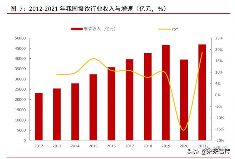 剔除疫情因素的影響,我國餐飲行業收入規模穩步增長。我國餐飲行業近幾年發展態勢良好。2020 年受疫情影響,餐飲行業受到嚴重沖擊,實現營業收入 3.95 萬億元,同比下降 15.42%。若剔除 2020 年的特殊情況,2012-2019 年,我國餐飲行業收入規模穩步增長,收入從 2.34 萬億元增加至 4.67 萬億元,年均復合增速為 10.38%。隨著疫情好轉,2021 年餐飲行業逐步復蘇回暖,營業收入為 4.69 萬億元,同比增長 18.64%。2019-2021 年,我國餐飲行業的年均復合增速為 0.19%。