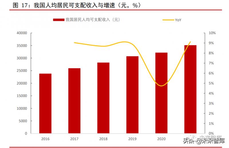 隨著我國經濟不斷發展,人均居民可支配收入穩中有升。2016-2020 年,我國人均可支配收入從 23821 元增加至 32189 元,年均復合增速為 6.2%。2020 年在疫情影響下,我國人均可支配收入仍保持 4.74%的 增長。2021 年,我國人均居民可支配收入為 35128 元,同比增長 9.13%。在生活質量不斷提高的背景下,居民對預制菜的價格接受度亦有所增加。根據艾瑞咨詢數據顯示,我國預制菜單次消費在 21-30元的消費占比為 36.50%,在 31-40 元的消費占比在 20%以上。居民消費水平的提高,一方面可以帶動預制菜消費量的增加,另一方面可以增加居民對預制菜的價格接受程度,有利于預制菜企業產品結構升級。
