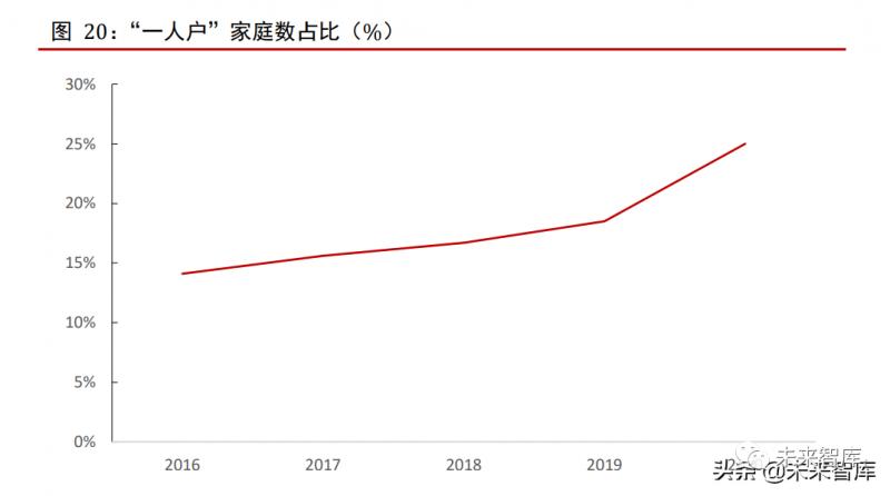 近幾年,我國越來越多的女性進入勞動力市場參與工作,使預制菜在家庭端的需求有所增加。與此同時,受晚婚、在一線城市打 工人數增加等因素影響,我國“一人戶”家庭數占比呈現增長態勢。2016-2020 年,我國 “一人戶”家庭數量占比從 14.10%增加至 25%。預計到 2030 年我國獨居率或將超過 30%。女性勞動參與率上升、“一人戶”家庭數占比提高等 現象使消費者對菜肴的便捷、快速、美味等要求有所提高。而預制菜的發展可以滿足我國人口結構變化,更好的順應社會發展趨勢,進而帶動市場對預制菜需求的增加。
