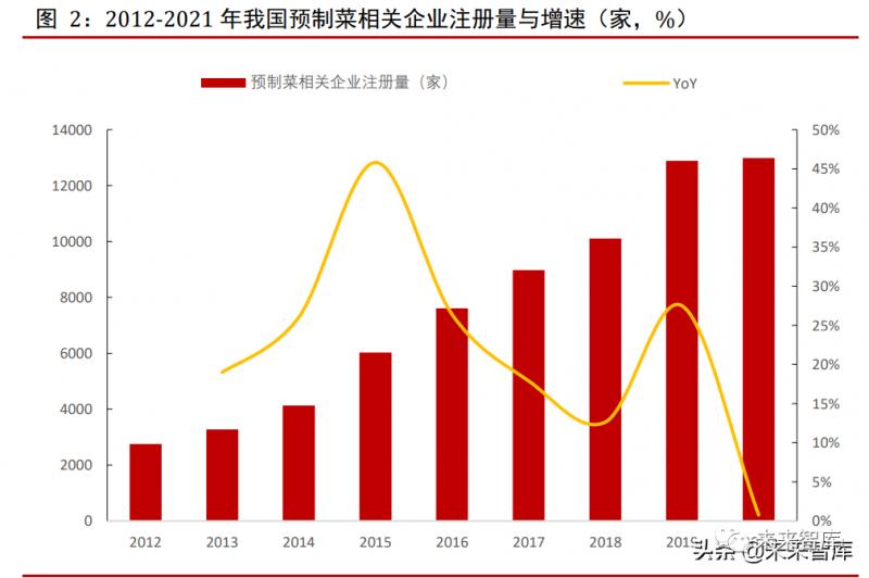 我國預制菜企業注冊量呈快速增長態勢。近幾年我國預制菜市場發展速度較快,預制菜相關企業注冊量亦呈現快速增長態勢。根據企查查數據顯示,2012-2020年,我國預制菜相關企業注冊量從2754 家增加至12983家,年均復合增速達到21.39%。從市場主體規模來看,截至2022年1月27日,我國預制菜相關企業已達到6.81萬家。