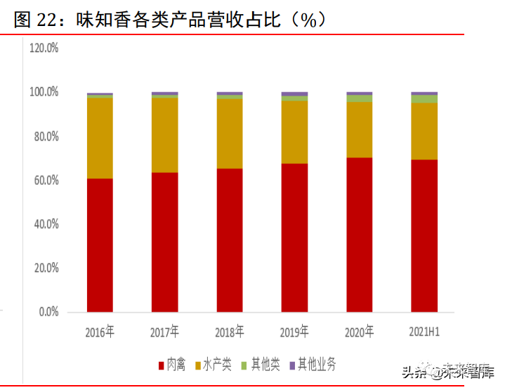 公司是行業內領先的預制菜生產企業之一。公司成立于 2008 年,是領先的預制菜生產企業之一,建立了以“味知香”和“饌玉”兩大品牌為核心的產品體系。公司產品包括肉禽類、水產類及其他類,涵蓋數百種菜品,有效地滿足了不同地區消費者的飲食習慣和口味偏好。從收入構成來看,肉禽類產品是公司核心產品,近幾年收入占比不斷上升(由 2016 年的 60.8%上升至 2020 年的 70.1%),其中牛肉類占比最大。
