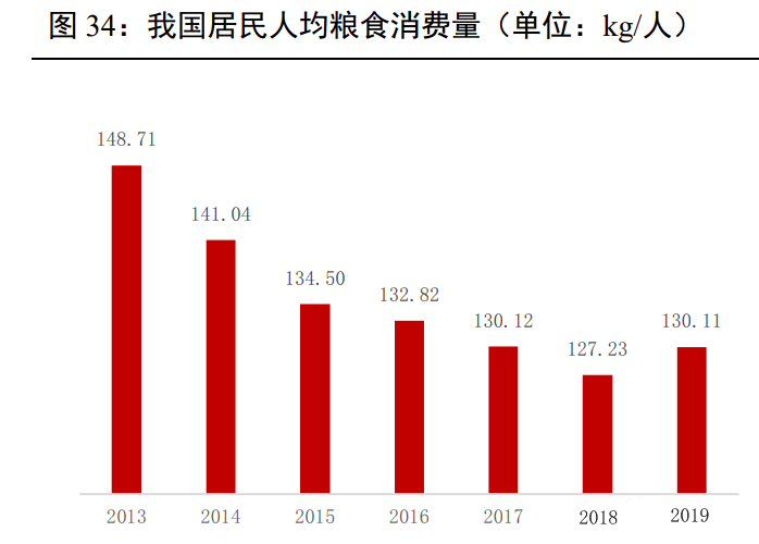 2013-2020 年我國居民人均糧食消費量持續(xù)下降,而肉類人均消費量持續(xù)上升。2019年因為非洲豬瘟影響生豬供應(yīng)量大幅下降,我國居民人均肉類消費量下降至 26.9kg/人,與此同時人均糧食消費量上升至130kg/人。