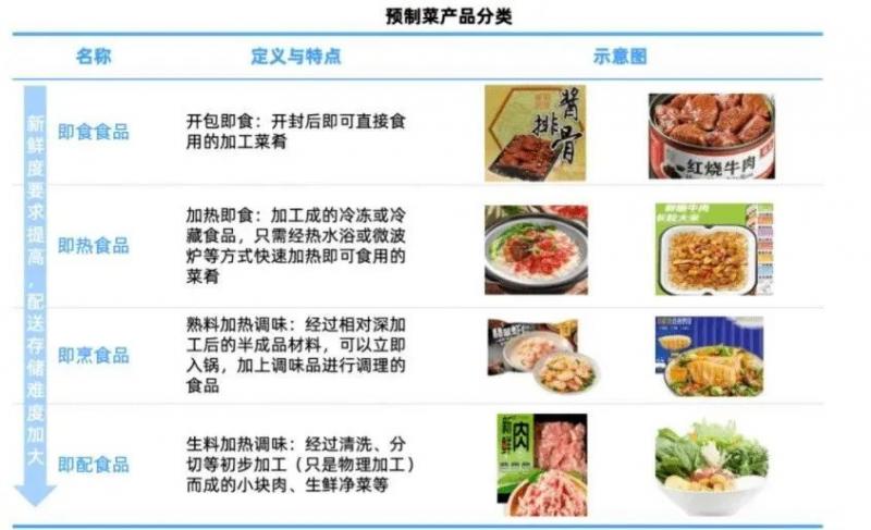 預(yù)制菜根據(jù)加工程度不同可以分為 4 類:即食食品、即熱食品、即烹食品、即配食品。即食食品開封可以直接食用;即熱食品是商家已經(jīng)做好的菜,用微波爐、煮鍋蒸鍋加熱后可以食用,如近年來市場上較為活躍的快餐料理包、自嗨鍋等;即烹食品以油炸類食品為主,例如酥肉、薯條等;即配食品需要自行配菜、調(diào)味、烹飪,是四類中操作環(huán)節(jié)最多的預(yù)制菜。