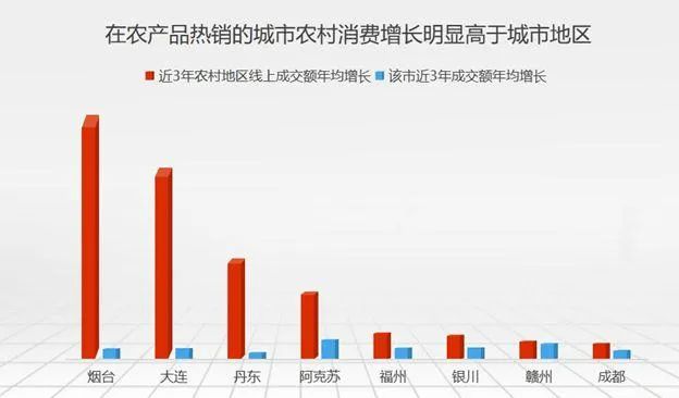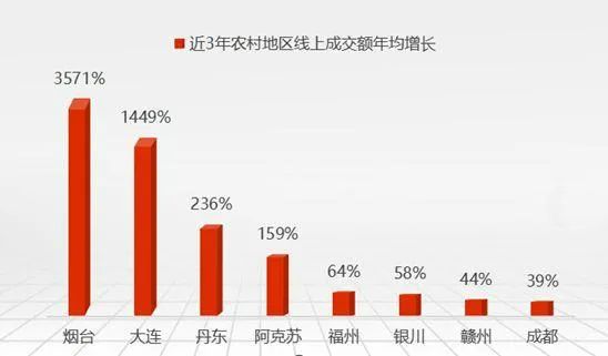 在農產品熱銷的幾大產地,煙臺、大連近3年農村地區線上成交額年均增長都超過了10倍,丹東、阿克蘇近3年農村地區線上成交額年均增長超過150%。