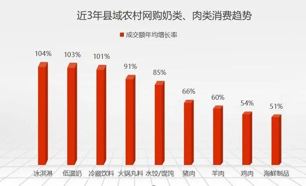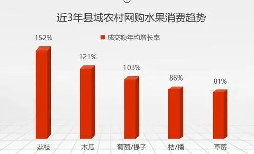 食品消費是農村消費升級的縮影。近三年,水果、奶制品、肉類等在農村生活品類線上消費占比中有顯著提升,說明的是食品消費結構的變化,隨著生活水平的提高,飲食觀念也發生著變化,一是以奶制品為代表的營養食品漸受青睞,二飲食結構搭配更均衡,這在豬、羊、雞肉、海鮮都有不同程度漲幅中都有體現,值得一提的是,火鍋丸類、水餃云吞等冷凍速食類商品的需求越來越高,與城市消費的特點越來越趨同;三除了講究營養,吃得健康外,吃新鮮、吃時令也成了農村食品消費需求的重要觸發點,其中以荔枝、木瓜為代表的等熱帶水果年均增長率達152%。農村食品消費從實惠吃飽走向嘗鮮吃好的趨勢十分明顯。